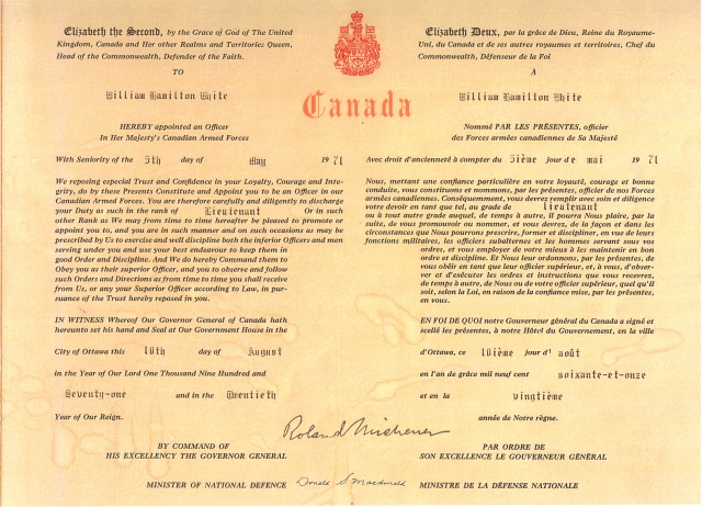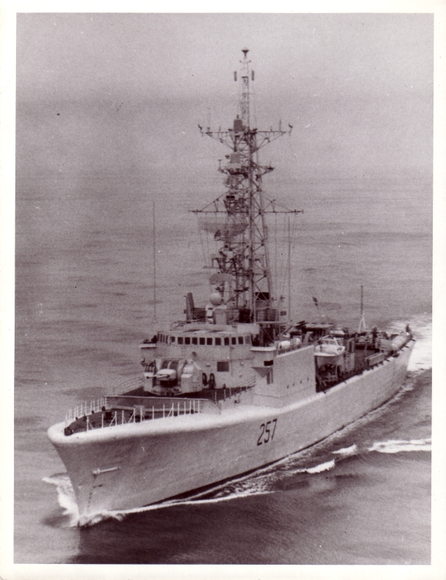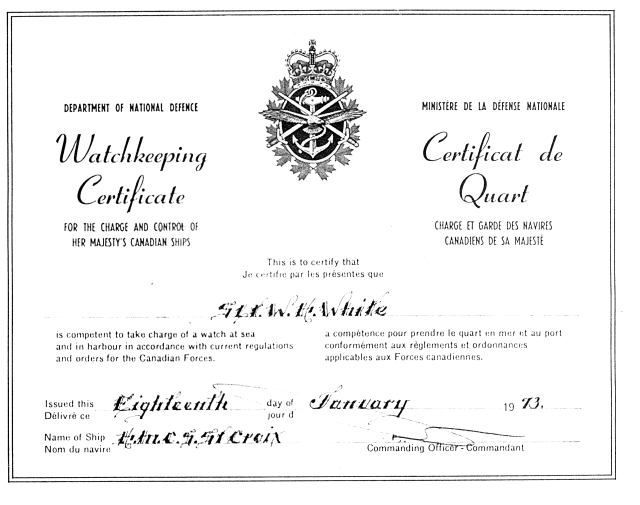 8. Oh, what the heck, here are a couple of my naval certificates as well. For now these are images of photocopies, and not very good ones. First and foremost my watchkeeping certificate that I earned over the course of a year or so of driving captains crazy. Involved navigation, pilotage, and a whole lot of other things. This is what gives permission to take charge of the ship temporarily for a 2 or 4 hour watch, sometimes when the captain and all the other officers are asleep. Then here is the one showing I qualified as a Communications and Electronic Warfare Officer. This is my commission, granted when I miraculously got through Officer Candidate School before I started naval training. Actually this is an image of a reduced photocopy of the real certificate. I have lots of other things to show and talk about from my short naval career, but not here! Just in case you are interested, here is a shot of the Restigouche, with myself in charge on the bridge.... well maybe not, but I could have been! This photo always makes me think this ship was top heavy and could flip over quite easily, but apparently not...