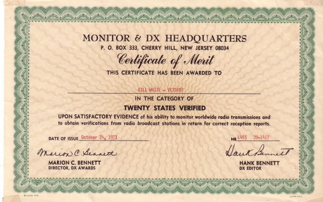 2. Monitor Certificate. Later when Popular Electronics itself discontinued the registration program, Hank Bennett who I suspect had left Popular Electronics, continued the system under the auspices of "Monitor and DX Headquarters" The certificates were identical except for colour and names, and the identifier was changed. I also received certificates for 20 States confirmed and for 25 Countries confirmed. I dont know why I never received higher ones, likely I did not meet the next plateau, or the system was discontinued.