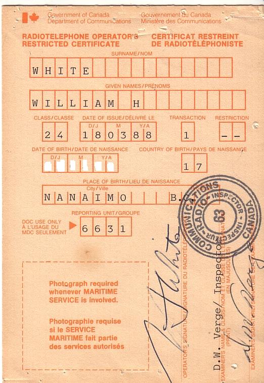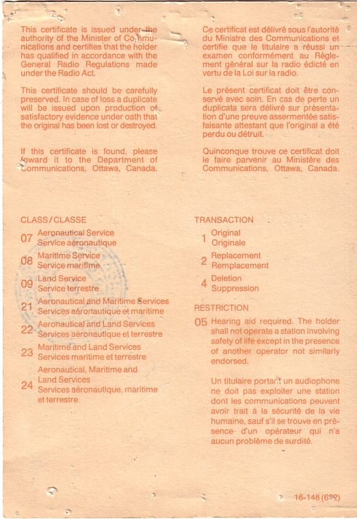 4. Restricted Radiotelephone Operators Certificate. This one is endorsed as Class 24 meaning that it is good for Land, Sea and Air. I got this for fun or maybe I thought i was going to be a pilot or something. Here is the back of the same one.
