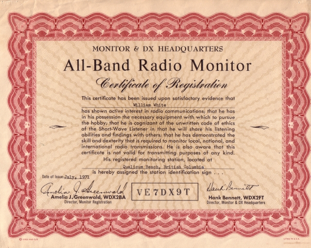 1. My short-wave monitoring certificate. Back in the 60's Popular Electronics was the major magazine for general radio enthusiasts. They started a program to have short-wave listeners, or really listeners to any band, to register themselves and get a "neat" (the word before "groovy" came along) certificate. They also offered certificates for having proved listening to various states and countries. Actually they may not have required proof, just an itemized list. The listener registration system involved call-sign-like identifiers that were made up of the ham call sign prefix for the area of residence followed by PE and a number/letter pair. I lived in BC so mine was VE7PE9T.