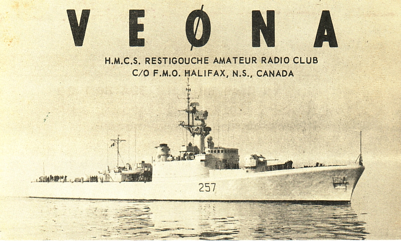 7. This is really a QSL card, but not sent to me. This is from VE0NA, the amateur station on board HMCS Restigouche, a destroyer escort in the Canadian navy. This ship now lies at the bottom off the coast of Mexico, but in the early 70's I was the Communications Officer on this ship and technically in charge of all the radio equipment and even the amateur station (which of course used the naval equipment) I was not a ham at the time and never operated the equipment.