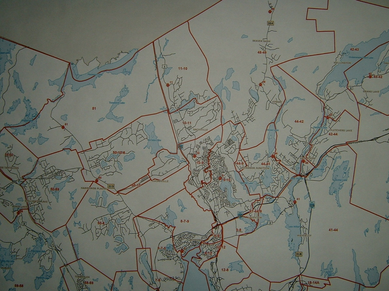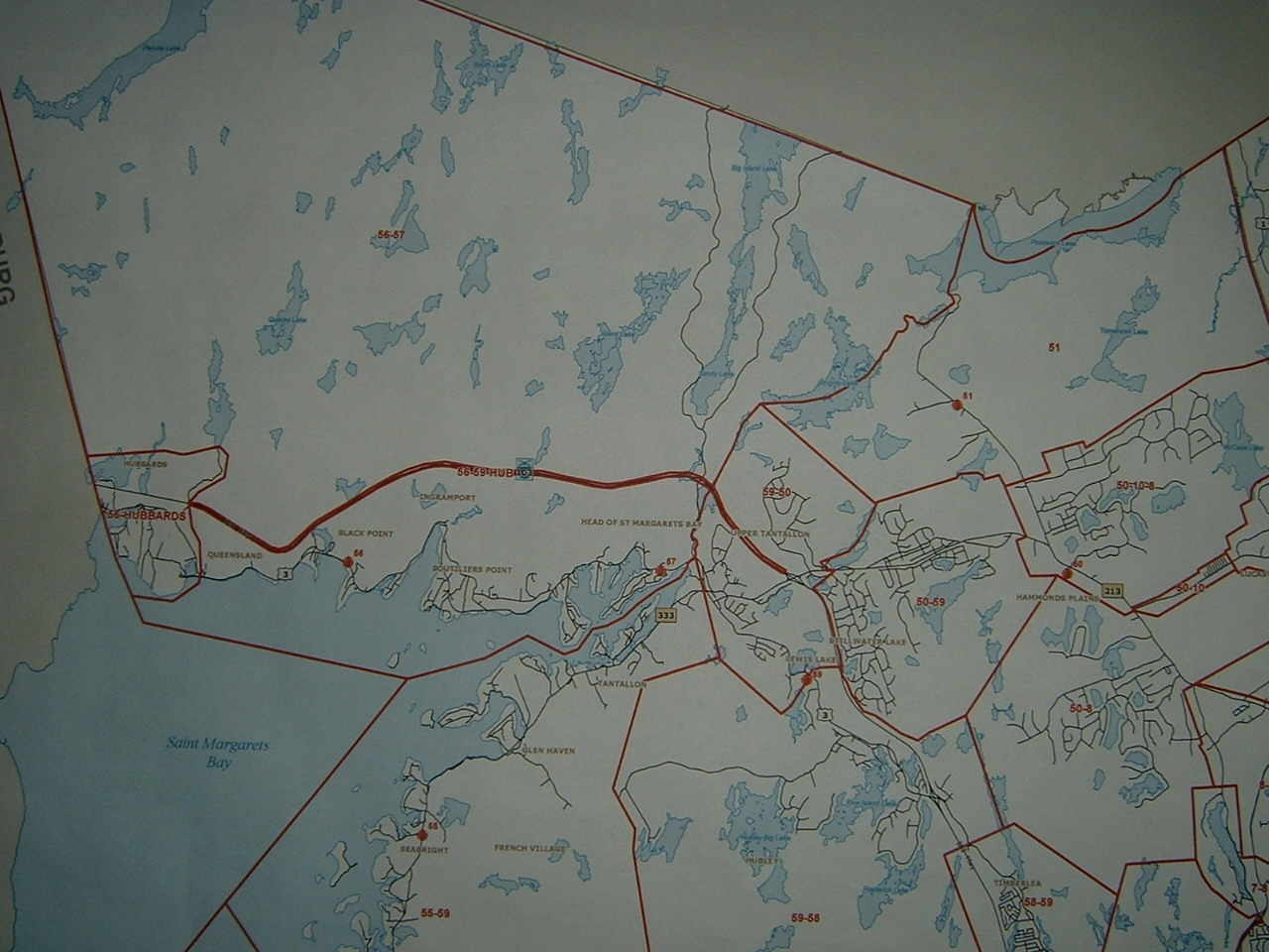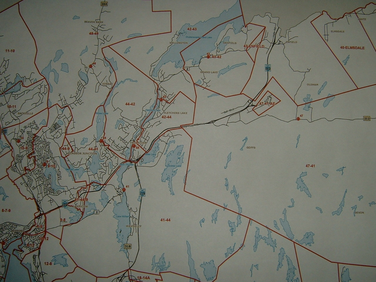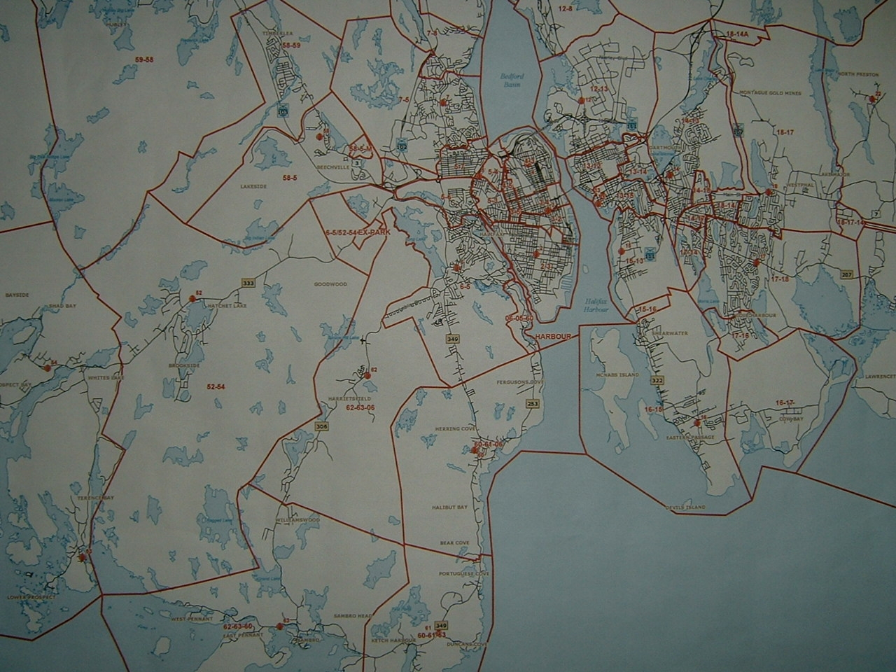 The following photos are segments of the large HRFE map showing the response areas for each station. Each area outlined in red has one to three station numbers... this being the primary station, the first backup station, and perhaps an additional station. This indicates the order of response for dispatch purposes. Where a location is mentioned rather than a station number, this refers to a non-HRFE station. Unfortunately I do not have complete coverage, with the worst gap being in the interior east end of HRM. Photo geographical descriptions are very approximate and are not listed in any particular order. These photos of an actual official response map were taken in approximately 2006.