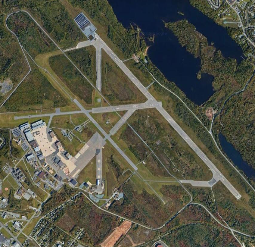 Photo Caption: This is a modern aerial photo of Shearwater, current in 2019. Historical runways are still evident. The former Runway 16/34 is the longest one extending prominently at an angle on the right. It is abandoned but relatively intact except for some unknown usage at the top left end. Older runway segments include the one extending almost straight up and down on the photo. This has not been used in many years. Runway 10/28 extends nearly horizontally across the photo. It was in use until at least the 1980's but only the narrowed west end containing helicopter pads remains in use. The wider east end is unused. All of the light coloured wide runways on the upper right and with X's painted on them are actually outside the modern Shearwater base property, and are awaiting an uncertain fate. The shorter runway extending at a 45 degree angle down the middle of the photo is the modern Runway 16H/34H. It is based on a long disused older runway (clearly seen in the historical photo) whose extent is easily seen in the cleared grassy areas. This modern runway is capable of being used by military STOL flights if necessary. There is yet another disused runway remnant, that being the section in the middle of the photo extending at a 45 degree angle at right angles to the 16/34 runways. Most of it was long ago incorporated into the large rectangular ramp.