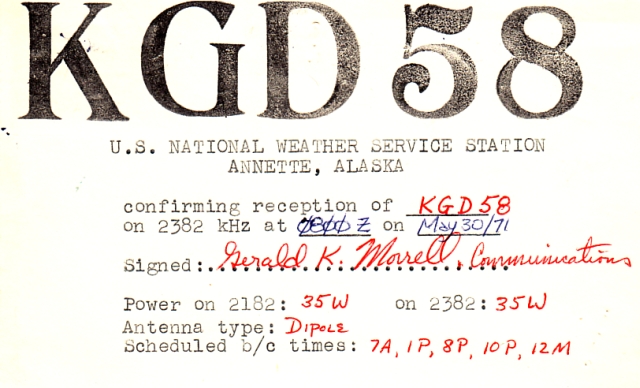 KGD58 US Weather Service, Annette AK May 71 VBA Thunder Bay Marine Radio, May 71 VAF Alert Bay Marine Radio, Dec 65 VAG Bull Harbour Marine Radio, Jun 66 VAI Vancouver Marine Radio, May 66 VAM Cape St. James Light Station, Mar 65 VAP Churchill Marine Aeradio, Apr 71 VBG Toronto Marine Radio, Oct 65