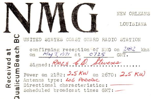 US Coast Guard (3 letter are mostly Radio Stns or Air Stations. Others are stations, light stations or LORAN stations) I had a campaign to get all the existing 3 letter stations. The NMx ones missing are NMD and NMH. The NOx series are more obscure but there are a few that I should have gone after but either did not hear or did not try. Now they are gone! | Other 2 MHz Coast Stns (Canadian, Marine Operators, US Army Alaska, Weather Service Alaska, etc.) |