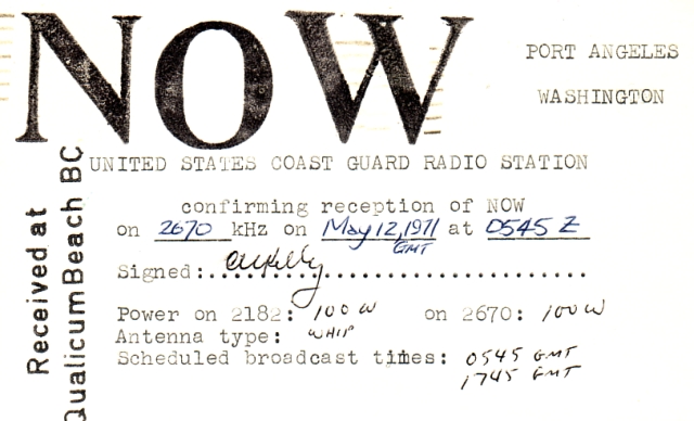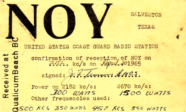 NMA Miami, Dec 65 NMB Charleston, Oct 71 NMC San Francisco, May 71 NMC11 Humboldt Bay, CA, Jan 72 NMD2 Cleveland Hbr, Oct 71 NMD4 Oswego, NY, Sep 71 NMD7 Rochester, NY, Dec 71 NMD12 Fairport, OH, Oct 71 NMD13 Lorain, OH, Oct 71 NMD22 Port Huron, MI, Oct 71 NMD24 East Tawas, MI, Oct 71 NMD29 Ashtabula, OH, Oct 71 NMD34 Charlevoix, MI, Nov 71 NMD35 Alexandria Bay, NY Nov 71 NMD40 Manistee, MI, Jan 72 NMD47 Buffalo, NY Sept 71 NMF Boston, Dec 65 NMF2 Woods Hole, MA, Oct 71 NMF6 Chatham, MA, Oct 71 NMF7 Boston Group Office, Nov 71 NMF13 Gloucester, MA, Nov 71 NMF14 Gay Head, Martha's Vineyard, Nov 71 NMF18 Portsmouth, NH, Dec 71 NMF21 Castle Hill, RI, Dec 71 NMF28 Seguin I Light, Maine, Nov 71 NMF30 Boothbay Hbr, ME, Nov 71 NMF31 Portland ME Group Office, Nov 71 NMG New Orleans, May 71 NMJ, Ketchikan, AK, Dec 65 NMJ1 Juneau, AK, Jan 72 NMJ18, Biorka I., AK Loran Stn, May 71 NMK Cape May, New Jersey NMK3 Atlantic City, NJ, Nov 71 NMK21 Indian River, DE, Nov 71 NML, St Louis Missouri, Dec 65 NMN Portsmouth, Sep 71 NMN12 Cape Lookout, NC, Nov 71 NMN35 Crisfield, MD, Nov 71 NMN37 Fort Macon, NC, Sept 71 NMN76 Wrightsville Bch, NC Nov 71 NMN77 Ocean City MD Nov 7`1 NMN85 Little Creek, Virginia, Nov 71 NMO Honolulu, May 71 NMP Northbrook, Illinois, Dec 65 NMQ Long Beach, May 71 (hrd in BC) NMQ Long Bch, Dec 71 (hrd in Quebec) NMP2 Michigan City, Indiana, Oct 71 NMP11 Sheboygan, WIS, Jan 72 NMP12 Two Rivers, WIS, Nov 71 NMP14 Sturgeon Bay, WIS Nov 71 NMR San Juan, PR, Oct 71 NMV Jacksonville Bch, Oct 71 NMW Westport, WA, Apr 65 NMW18 Grays Hbr, WA Mar 72 NMW43 Seattle Group Office, May 71 NMW51 Astoria Group Office, OR Mar 72 NMX Baltimore, MD Sept 71 NMY East Moriches (NY), NY Nov 71 NMY12 New London, CT Dec 71 NMY45 Fire Island NY, Oct 71 NMY46 Atlantic Beach, NY, Oct 71 NMY51 Rockaway NY Group Office, Dec 71 NMY53 Shark River, NJ, Nov 71 NOF St Petersburg, Dec 65 NOG Sault Ste Marie, MI, Nov 71 NOG5 Marquette, MI, Dec 71 NOG14 Duluth, MN, Nov 71 NOG15 North Superior, WI, Jan 72 NOJ Kodiak, Alaska, Apr 71 NOR San Diego, Mar 72 NOU Annette I Air Stn, Apr 72 NOW Port Angeles, WS Air Stn, May 71 NOY Galveston, Nov 71 (from Quebec) NOY Galveston, Apr 65 Ambrose Light Station, Oct 71 Listed but no link, or link not working... updates and fixes coming soon... along with more QSL's