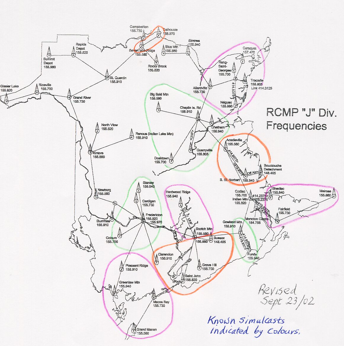 The force is reported to also on occasion use the nationally allocated frequencies in the 420 MHz range for special purposes; however it is thought that most of those communications are encrypted. Click here for a page contributed in February 2004 showing 400 MHz frequencies possibly in use by RCMP in NB.