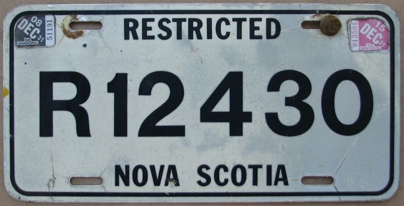 This is a small category of Nova Scotia licence plates that has a few uncertainties for collectors, in terms of introduction, manufacture, use by department, and serial system. Any information or opinions you wish to share will be greatly appreciated I AM ACTIVELY RESEARCHING THIS TOPIC AND HOPE TO PROVIDE UPDATES AND POSSIBLY CORRECTIONS. Please message or email me to let me know what restricted plates you have, with serial and type, and if you know what government department or municipality it came from. This will greatly aid my research. Thanks. email is marscan1 AT gmail.com Restricted plates may be issued for use on vehicles owned by provincial and municipal entities. Federal agencies and departments are not included. Department of National Defence vehicles have their own federally-issued plate type, whereas other federal departments use regular Nova Scotia plates. Restricted plates may be used on a variety of vehicle types including passenger cars, trucks and trailers. A special smaller sized restricted plate is available for motorcycles, and will be described separately. All initial comments here refer to the full size plate. Origins: It is thought that restricted plates were introduced in the 1970's, produced separately "in-house" by the provincial sign shop. They were made of heavy aluminum and flat, essentially the same construction as road signs. It may be that at first they were only issued to the governnment department responsible for highways. This department has had many names over the years, and on this page will be referred to as the Department of Public Works (DPW), the sign shop being part of it. It has been said that that the heavy aluminum plates were specially produced due to highway maintenance vehicles being in a salty environment that was not suitable for regular commercially-produced plates. It does appear that in the early days these were permanent plates in the sense that they did not have annual or bi-annual renewals and stickers. In more recent years they have had stickers similar to other plates. The format for all full-size restricted plates is R followed by four digits (R#####). In my observations I have commonly seen plates with digits commencing with 0, 1 and 2. I have also seen a very few commencing with 9. What is not known, at least to collectors, is whether or not there is an allocation system for the serials. I suspect that a certain series or group of series is allocated to the Department of Public Works to produce at their sign shop (see Type 1 below). Otherwise it may well be that people from various agencies go to Access Nova Scotia and obtain whatever is available as needed, as is the case for other types of plates. It is my intent to try to observe more carefully as I see these plates on vehicles and attempt to come up with a pattern. TYPE 1 PLATES (FLAT HEAVY-WEIGHT ALUMINUM)